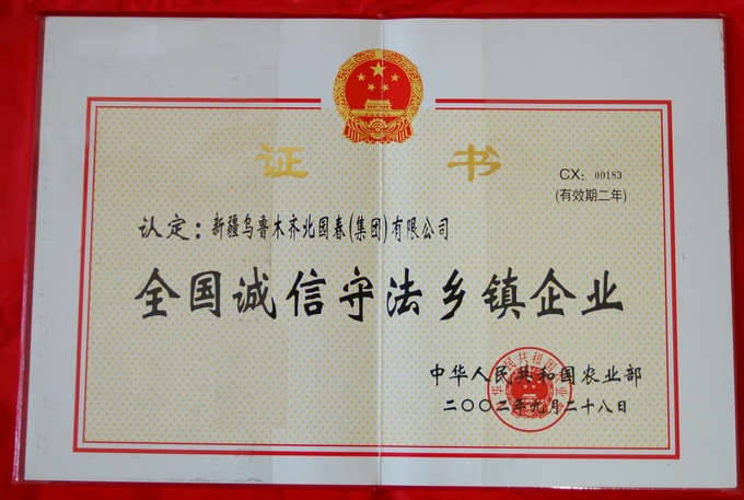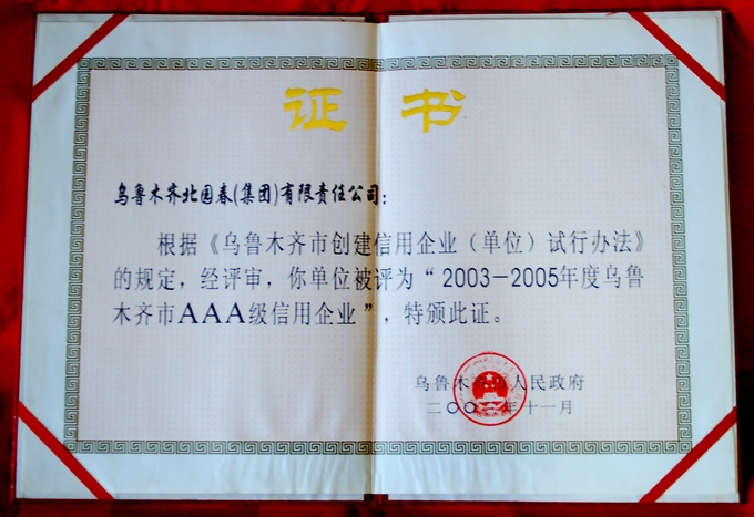 2003年11月,北園春集團(tuán)公司被烏魯木齊市人民政府評(píng)為“2003—2005年度烏魯木齊市AAA級(jí)信用企業(yè)”。