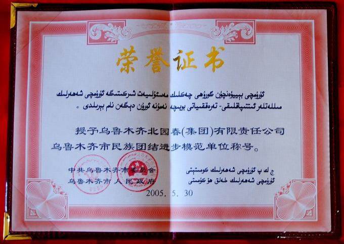 2005年5月,北園春集團(tuán)公司被烏魯木齊市人民政府授予“烏魯木齊市民族團(tuán)結(jié)進(jìn)步模范單位”稱號(hào)。