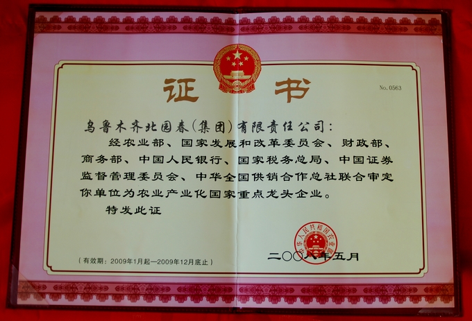 2008年5月,北園春集團(tuán)公司第四次被農(nóng)業(yè)部、國(guó)家發(fā)展和改革委員會(huì)、財(cái)政部、商務(wù)部等單位聯(lián)合審定為“農(nóng)業(yè)產(chǎn)業(yè)化國(guó)家級(jí)重點(diǎn)龍頭企業(yè)”。