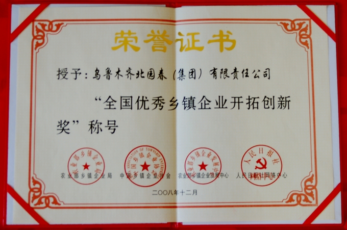 2008年12月,北園春集團(tuán)公司榮獲農(nóng)業(yè)部鄉(xiāng)鎮(zhèn)企業(yè)局、農(nóng)業(yè)部鄉(xiāng)鎮(zhèn)企業(yè)發(fā)展中心等單位聯(lián)合頒發(fā)的“全國(guó)優(yōu)秀鄉(xiāng)鎮(zhèn)企業(yè)開(kāi)拓創(chuàng)新獎(jiǎng)”稱號(hào)。