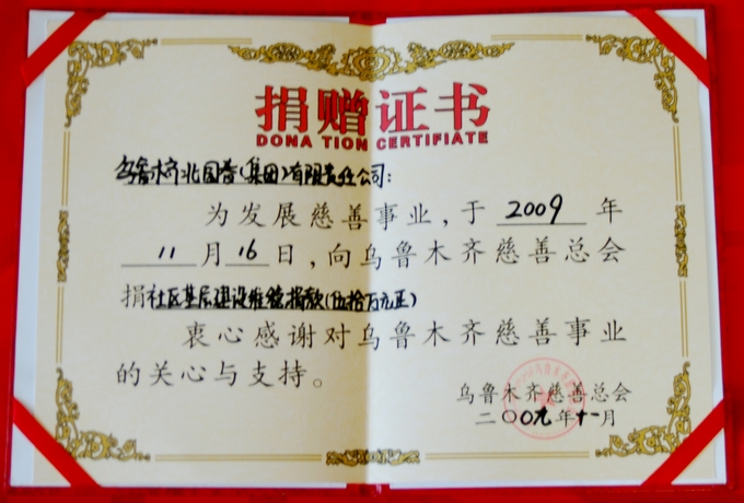 2009年11月,北園春集團(tuán)公司向?yàn)豸斈君R慈善總會(huì)捐款50萬(wàn)元作為社區(qū)基層建設(shè)維穩(wěn)專項(xiàng)資金。