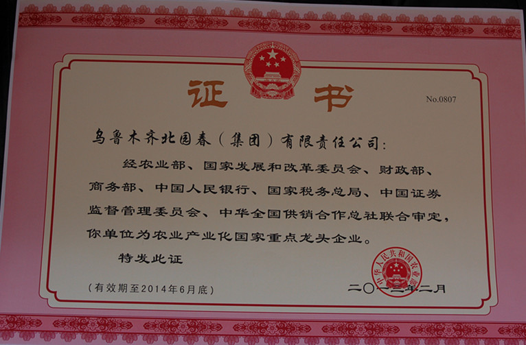 2013年2月,北園春(集團(tuán))公司經(jīng)國(guó)家農(nóng)業(yè)部第六次監(jiān)測(cè)審定為“農(nóng)業(yè)產(chǎn)業(yè)化國(guó)家重點(diǎn)龍頭企業(yè)”(有效期至2012年7月1日-2014年6月31日)。