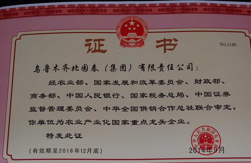 2014年9月,北園春(集團(tuán))公司經(jīng)國(guó)家農(nóng)業(yè)部第七次監(jiān)測(cè)審定為“農(nóng)業(yè)產(chǎn)業(yè)化國(guó)家重點(diǎn)龍頭企業(yè)”(有效期至2016年12月31日)。